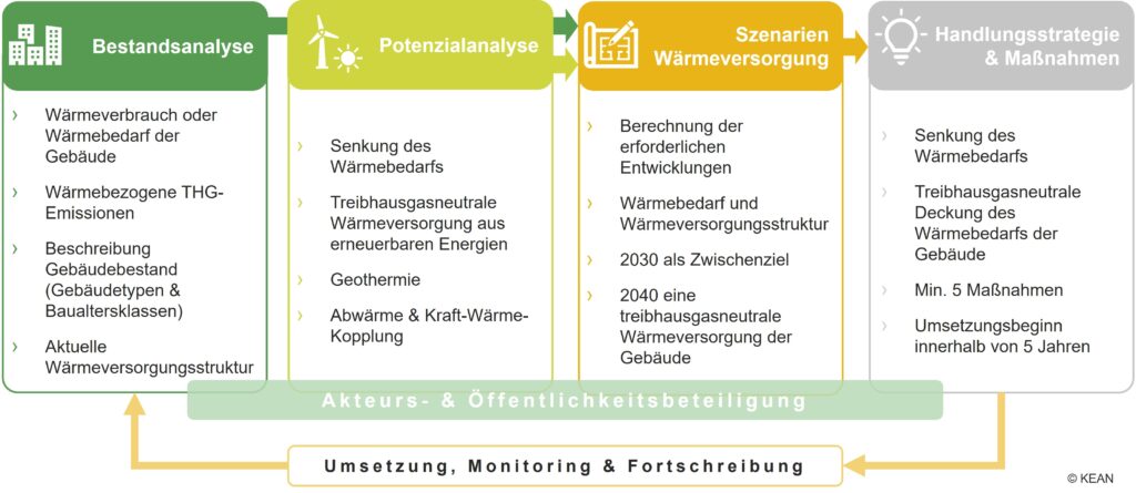 Die Kommunalen Wärmeplanung erfolgt in vier Phasen und ihr Ablauf ist im Wärmeplanungsgesetz (§13 WPG) geregelt. Zunächst wird die aktuelle Wärmeversorgungssituation im gesamten Gemeindegebiet analysiert (Bestandsanalyse). Hierzu werden Daten über den Wärmebedarf und Wärmeverbrauch, den Gebäudebestand sowie die Energieinfrastruktur erhoben und ausgewertet und die wärmebezogenen Treibhausgasemissionen ermittelt. Die Daten werden vom Energienetzbetreiber und den bevollmächtigten Schornsteinfegern zur Verfügung gestellt. Im zweiten Schritt wird im Rahmen einer Potenzialanalyse ermittelt, wie der Wärmebedarf gesenkt werden kann und wo und in welchem Umfang im Gemeindegebiet Wärmequellen aus erneuerbaren Energien und Abwärme sowie Wärmespeicher zur Verfügung stehen. Anschließend werden erforderliche Entwicklungen im Bereich Wärmebedarf und Wärmeversorgungsstruktur aufgezeigt, wie bis zum Jahr 2045 eine klimaneutrale Wärmeversorgung in der Gemeinde ausgestaltet werden kann (Zielszenario). Zuletzt wird eine Handlungsstrategie erarbeitet und spezifische Maßnahmen definiert, die innerhalb der nächsten fünf Jahre umgesetzt werden sollen (Umsetzungsstrategie), um eine treibhausgasneutrale Deckung des Wärmebedarfs der Gebäude bis 2045 zu erreichen.